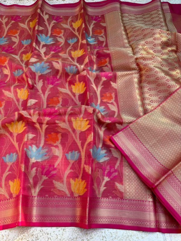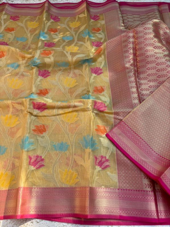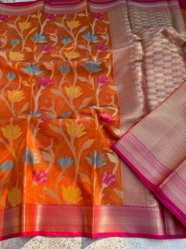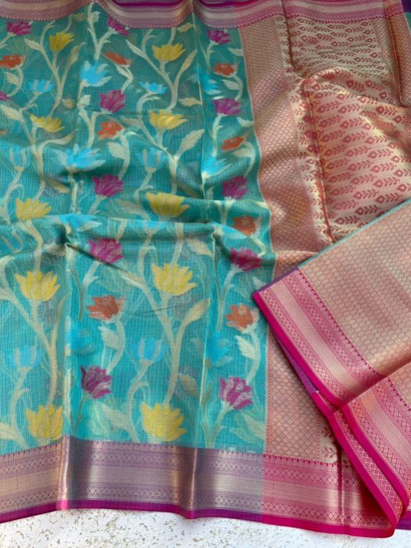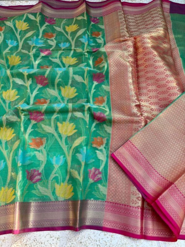 Looking for banarasi semi Kora check saree full body flower meena and zari waiving small border wiving rich pallu broket blouse 5 colour available